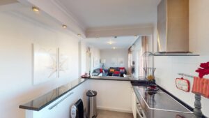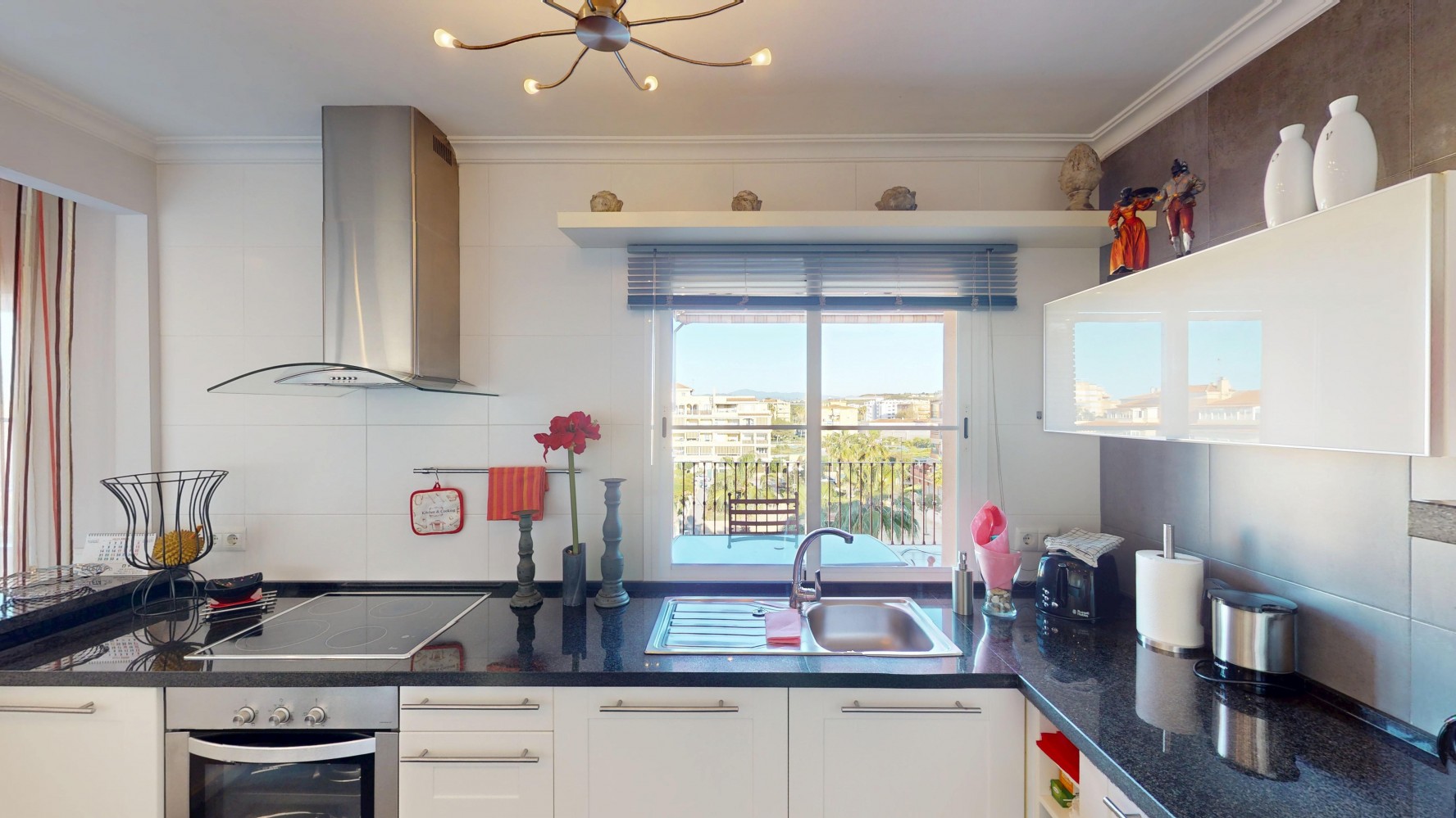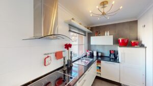 • Kuchnia: otwarta, nowoczesna – białe meble, czarne blaty, sprzęt ze stali nierdzewnej